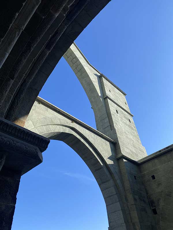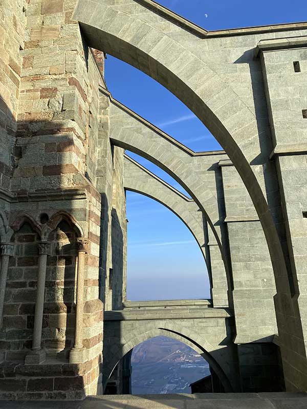 I CONTRAFFORTI MODERNI: si esce attraverso il portale dello Zodiaco, nuovamente alla luce del sole e ci si trova su una terrazza sormontata da quattro imponenti contrafforti e archi rampanti progettati dall’architetto Alfredo D’Andrade e ultimati nel 1937. Questa zona era, a fine ottocento, completamente occupata da costruzioni e dunque il Portale dello Zodiaco non dava accesso a un terrazzo aperto, bensì ad ambienti coperti attraverso i quali si giungeva alla chiesa. Il D’Andrade intervenne demolendo tali ambienti e progettando la scalinata e gli archi rampanti, per far fronte al dissesto statico della parete sud della chiesa.