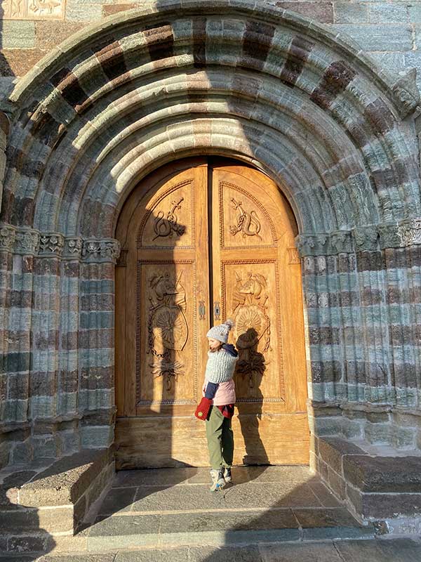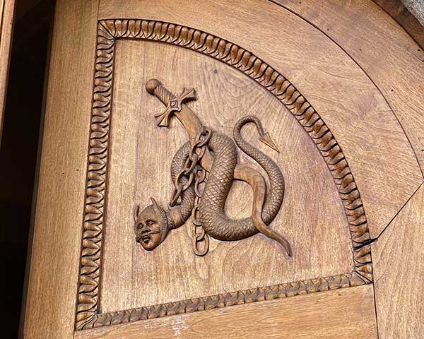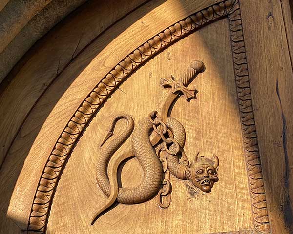 IL PORTALE DELLA CHIESA: qualche scalino e si giunge finalmente al portale della chiesa, romanico a fasce policrome. Il pesante portone in legno presenta sui battenti. il volto di due diavoli, simboli della malvagità, con il corpo di serpente avvolto da catene attorcigliate a una spada (simbolo di San Michele). A ben guardare però i volti dei diavoli sono differenti, uno benevolo, l’altro malvagio e una di queste catene non è completamente chiusa…significa forse che l’uomo è libero, con la propria volontà, di scegliere se esercitare il bene o il male?