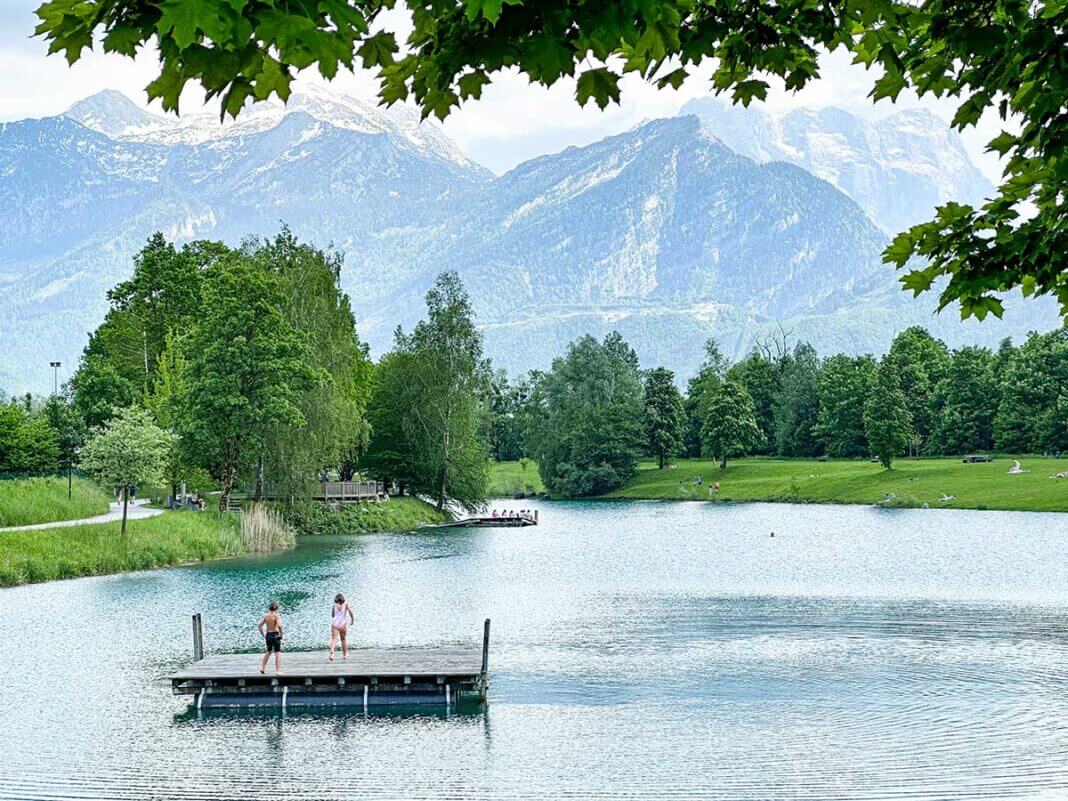 Noi dopo la visita alla fattoria ci siamo fermati, vicino a Golling, piccolo borgo di Kuchl, sulle rive del lago di Bürgerausee. Nessun turista e solo famiglie austriache, un prato immenso, parco giochi che i bambini hanno apprezzato moltissimo, bar e zattere nel lago per fare le gare di tuffi. Rifugio perfetto per un picnic o una lunga merenda.