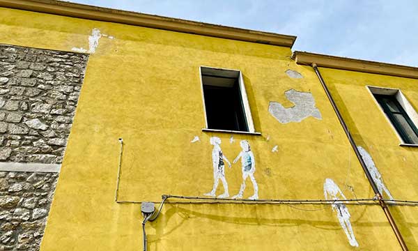 Il nostro cammino continua passando per i vicoli del borgo e Manuel si diverte a scovare murales che appaiono più nascosti rispetto ad altri che dominano sulle grandi facciate. Per i bambini, infatti può essere divertente proprio organizzare una caccia ai murales!