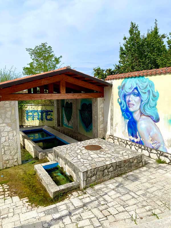 Nella foto a sinistra, la giovanissima artista Mariana Palomino ha utilizzato il lavatoio ancora in uso come tela per la sua opera “Carefully Wash”, a cui hanno collaborato anche i ragazzi del paese. La scena ritrae momenti di vita quotidiana di coloro che vanno a lavare i panni al lavatoio.