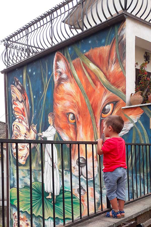 Partito il progetto cresce l’entusiasmo e i murales si moltiplicano, ne erano previsti 12, ma subito diventano venti ed oggi ce ne sono 36. E sparpagliati nel paese troverete anche installazioni, sculture, bassorilievi, edicole, mosaici (altre 12 opere) sempre ispirati al tema della fantasia.