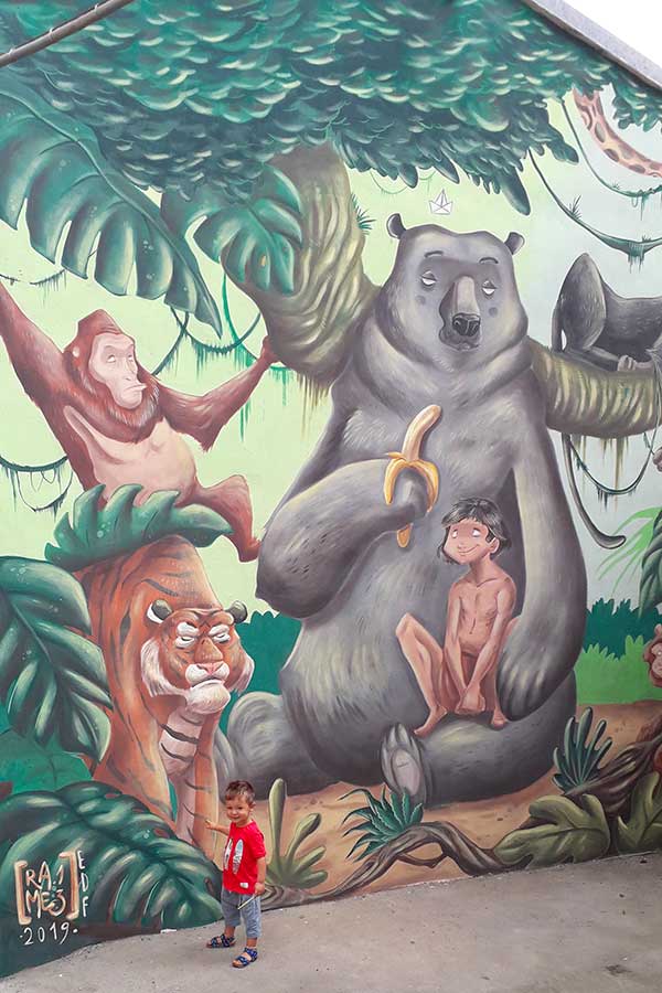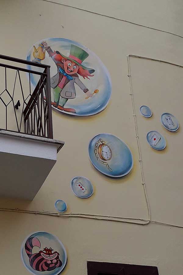 Il primo murale viene inaugurato nel novembre del 2017 e forse, quasi come augurio, la nuova storia di Sant’Angelo inizia da Alice nel paese delle meraviglie, nella piazza principale. Se guardate bene l’orologio nel murales segna le 11 e 27, perché il murale è stato inaugurato il 27 novembre e se girate l’angolo, sempre dipinti, trovate due bambini, che tirano una corda e fanno cadere il velo per rivelare l’opera al mondo.
