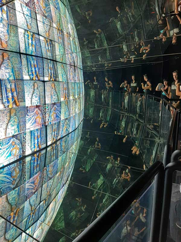 Ma il vero momento topico della visita è stato quando abbiamo raggiunto la sala della Quadrisfera: un’installazione innovativa (in Italia esistono solo altre due installazioni), pensata per coinvolgere il visitatore in un’esperienza di immagini, suoni ed emozioni a 360°, realizzando un’immersione totale e coinvolgente in ciò che il museo contiene.