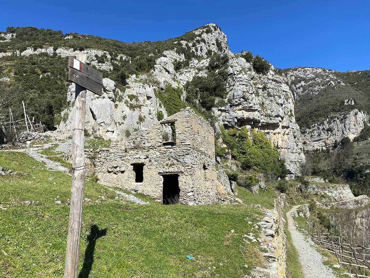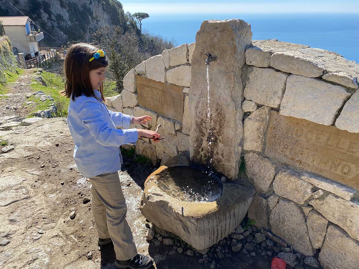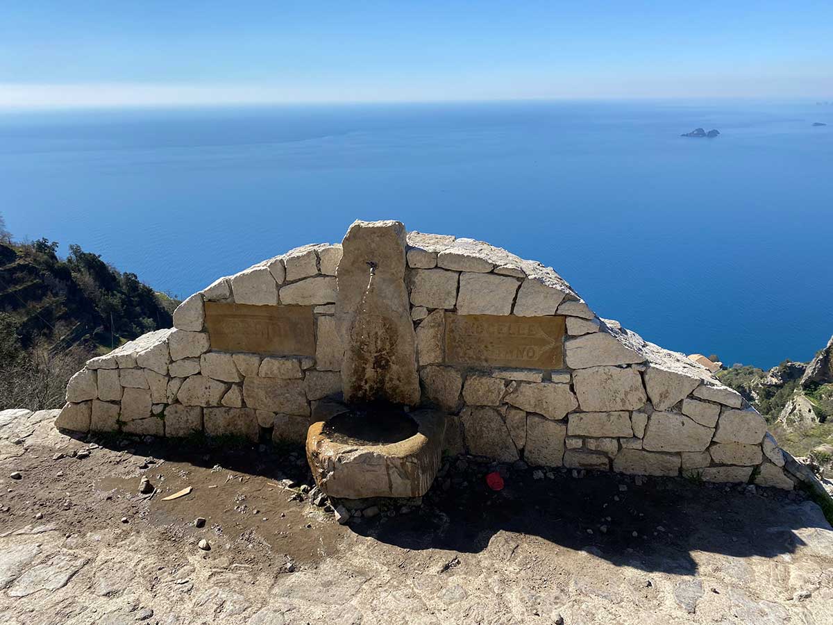 Da Colle Serra si percorre un primo tratto in discesa fino a raggiungere una fontana: sulla sinistra trovi la mulattiera che sale da Praiano, mentre sulla destra si prosegue per il Sentiero degli Dei.