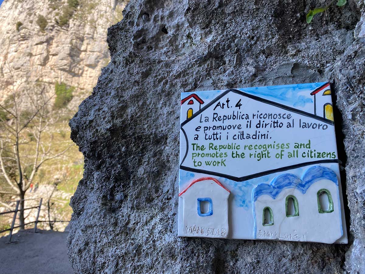 Lungo il cammino ci sono altre mattonelle di ceramica con gli articoli della Costituzione Italiana. Qualcuno ha ribattezzato questa strada come il “Cammino della Costituzione”.