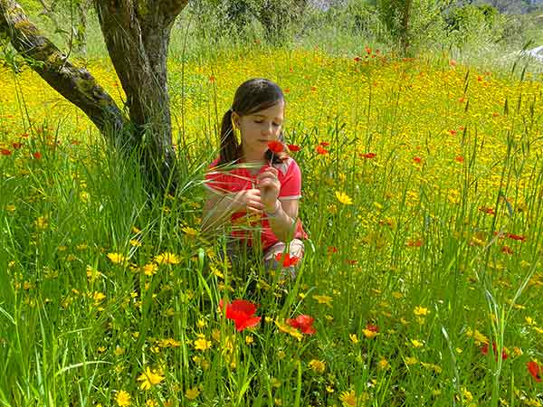 Il sentiero inizia da un grande prato, in primavera un tappeto di fiori gialli di campo e papaveri.