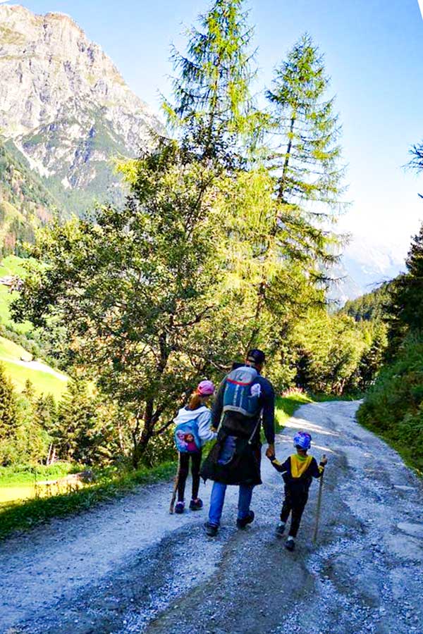 Con le dovute pause per far ristorare un attimo i bimbi, abbiamo portato avanti questa nostra prima escursione impegnativa con loro, ma una volta usciti dal tratto di bosco, quando davanti a noi sono comparse le Alpi dello Stubai con l’imponente massiccio Tribulaum di Fleres tutta la fatica ha iniziato a scemare colmata dal panorama da cartolina che ti riempie gli occhi di meraviglia.