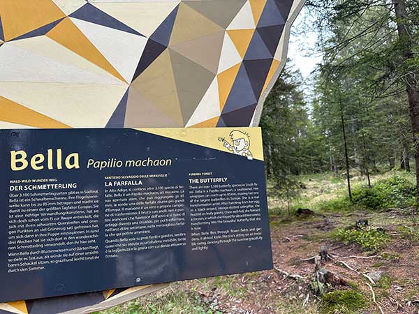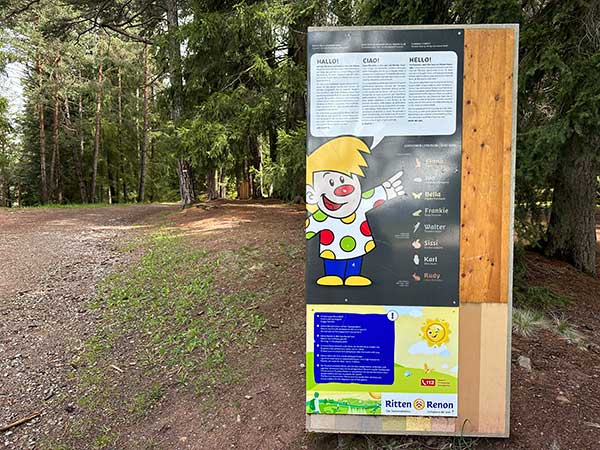 C’è Fiona la volpe furbetta, Walter il picchio attento, Bella la farfalla che vola libera … otto animali, otto storie da raccontare e otto giochi da provare. È il Funimal Forest, sentiero tematico sull’altopiano del Renon conosciuto anche come “Sentiero selvaggio delle Meraviglie”. Si trova a 1200 metri, sopra la città di Bolzano: una passeggiata di 3,6 chilometri solo andata, ma facilissima e adatta a tutti, anche ai bambini più piccoli in passeggino. Se cercate una passeggiata facile da fare con i bambini, questa è perfetta e divertente, loro si divertiranno e voi vi godrete il silenzio del bosco.