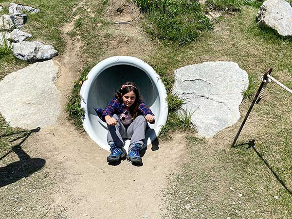 Da qui i bambini non vorranno andar più via: c’è un parco giochi, lo Skyway For Kids, con scivoli, dighe da aprire e chiudere, una zattera sul lago e una parete d’arrampicata. È piccolino, ma davvero c’è tutto…ci sono anche le sedie a sdraio per mamma e papà, che possono controllare i piccoli seduti al sole fresco di montagna, con vista su Courmayeur e sulle altre montagne della Valle d’Aosta.
