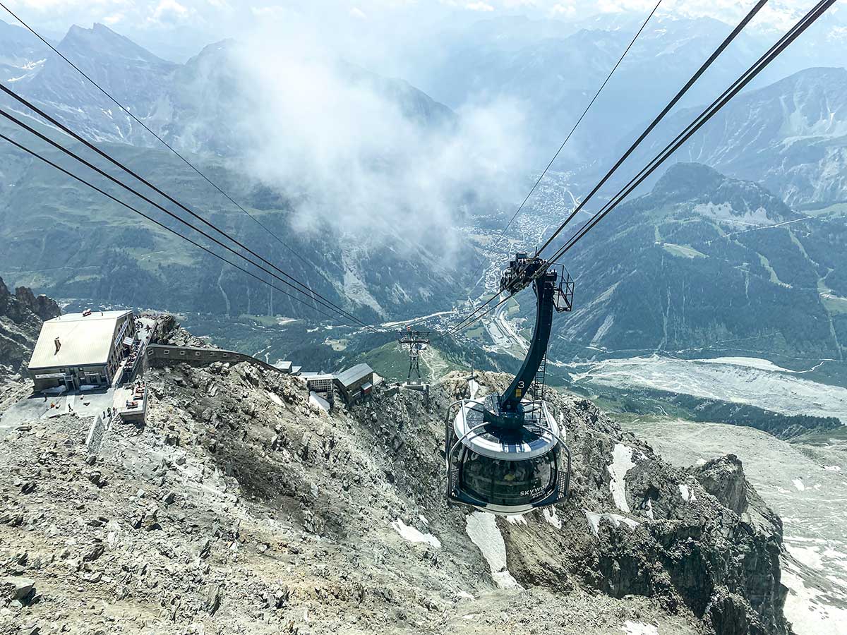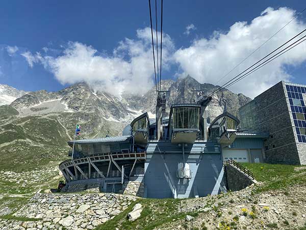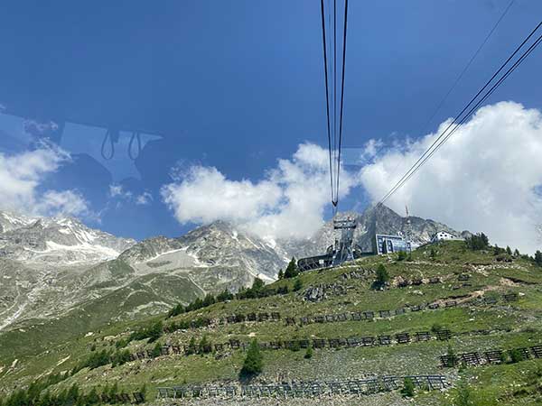 Per arrivare a Punta Helbronner( 3466 metri) ci vogliono circa 20 minuti, tramite 2 funivie consecutive da circa 10 minuti l’una. Le cabine sono nuovissime (l’avveniristica funivia è entrata in funzione nel 2015) , tutte di vetro e girano su se stesse. Durante il tragitto, per un attimo si ha l’effetto “montagna russa” con un piccolo saltino della cabina, ma assolutamente non fa paura. Ai bambini piace moltissimo, è come viaggiare in una bolla di sapone.
