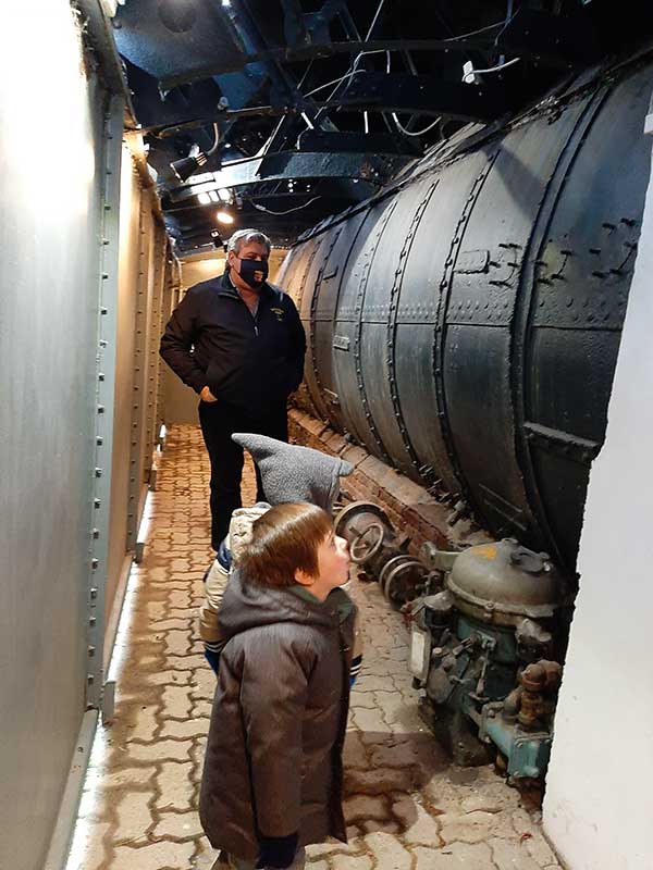 Il quattrenne è rimasto affascinato dalla quantità di leve, valvole e strumenti di bordo e, naturalmente, ha provato a manovrare il timone. Si è anche avventurato al piano superiore attraverso la ripida scaletta interna per provare il periscopio ma la guida ci ha spiegato che non è più funzionante perché i tedeschi durante la seconda guerra mondiale ne ha distrutto le lenti spaventati dall’idea che i nemici potessero spiarli.