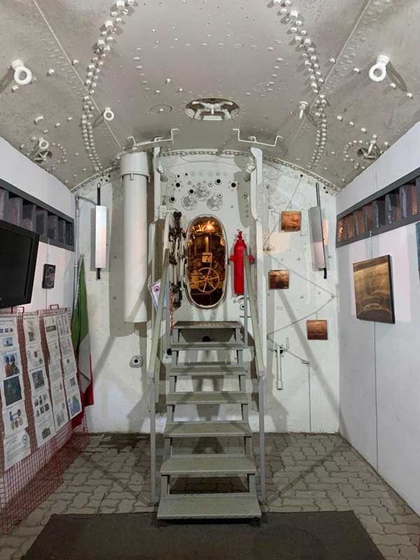 Il mezzo dentro il quale ci troviamo era lungo 67 metri ma se ne sono conservati solo 28, ovvero la parte centrale dove si trova la cabina di comando e la piccola cella dove si riposava il comandante. Gli spazi sono davvero angusti e ci si chiede come potessero viverci oltre 40/50 membri dell’equipaggio… La cucina e il bagno si trovano all’esterno pertanto potevano essere utilizzate solo quando il mezzo riemergeva e dovevano essere asciugati per poter essere utilizzati.
