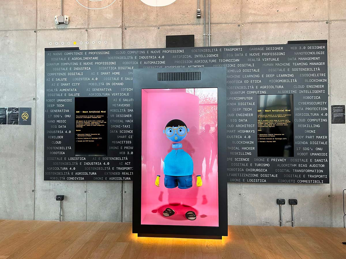 SAM si presenta sotto forma di avatar dal character originale e distintivo. Non ha gambe, braccia e non ha sesso, ma ha un bel caratterino e risponde in tempo reale – grazie al riconoscimento vocale – alle domande dei visitatori sulla trasformazione digitale, le tecnologie e il loro impatto sulla società.