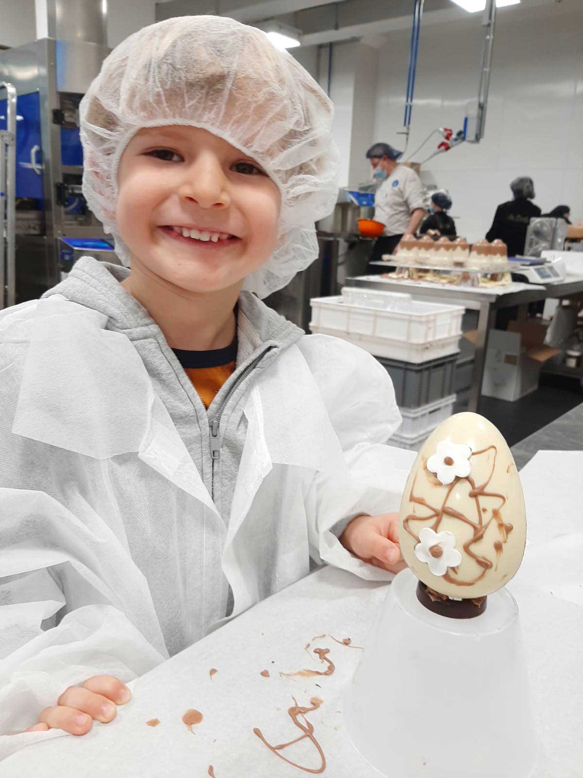 Ma il vero valore aggiunto della visita, oltre alla disponibilità e all’entusiasmo dei racconti di Filippo, è stato il poter realizzare un uovo personalizzato sotto la sua guida. Il quattrenne Arturo è stato invitato a creare il proprio sac a poche e a decorare una metà dell’uovo con cioccolato tiepido a cui sono stati aggiunti dei fiorellini di zucchero, ha potuto scegliere un piccolo dono da inserire all’interno e con un apposito strumento, dopo aver scaldato le due metà le ha incollate e raffreddate e messe su un piedistallo anch’esso in cioccolato. Una gentile pasticcera ha poi provveduto ad incartarlo perfettamente.