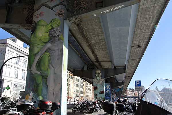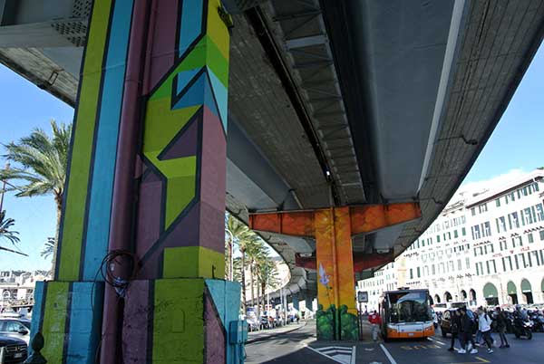 Anche per i bambini diventa così divertente seguire da sotto il percorso della sopraelevata, per scoprire, dal porto antico alla Stazione marittima tutti i diversi soggetti e i messaggi raffigurati nei piloni.