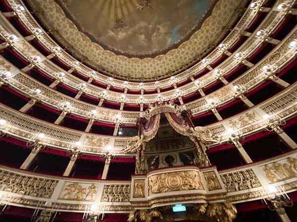 Il teatro di San Carlo con i bambini? Certo. È il teatro d’opera più antico del mondo: un luogo pieno di musica, di sogni, di emozioni. Solo spostare la pesante tenda di panno rosso e entrare in platea, alzare lo sguardo sul palco e ancora più su, sulla volta, dove c’è l’affresco dipinto da Giuseppe Cammarano e raffigurante Apollo che presenta a Mercurio i maggiori poeti greci, latini e italiani, è stupore puro. Il momento più emozionante, però, è quando si entra nel Palco Reale e si domina tutto il teatro dall’alto.