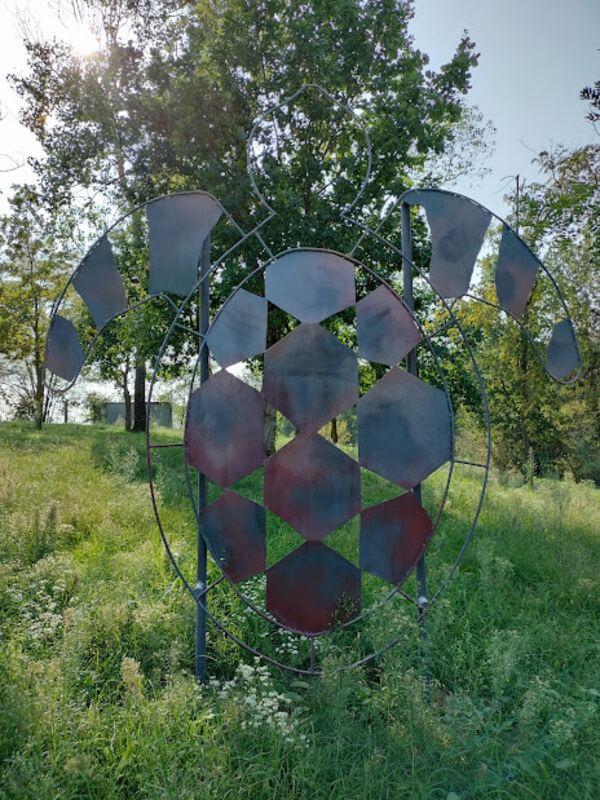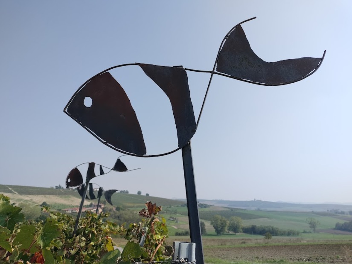Noi siamo stati accompagnati dall’artista stessa in una domenica di caldo anomalo di ottobre e, ammetto che abbiamo patito un po’ il sole, trattandosi di una passeggiata totalmente esposta, senza alberi. Non vi consiglio, quindi, di svolgerla in piena estate e, in ogni caso, di portarvi cappellino di protezione e acqua da bere poiché non vi sono fonti. La nostra partenza è stata la Cantina sociale di Casorzo, dove, potrete trovare diversi vini del territorio a prezzi competitivi. Da lì si prosegue verso i campi e dopo una mezzora di cammino si raggiunge il fossile numero 2, la chiocciola, in ferro modellato color ruggine. Brevissima sosta con foto di rito per riprendere la camminata e affrontare qualche salita in mezzo ai filari per raggiungere lo squalo, il fossile numero 5, ideato in onore del dente di squalo ritrovato in questo terreno. Alla sua base si possono veder, incastonate nella roccia, decine di conchiglie risalenti a migliaia di anni fa.