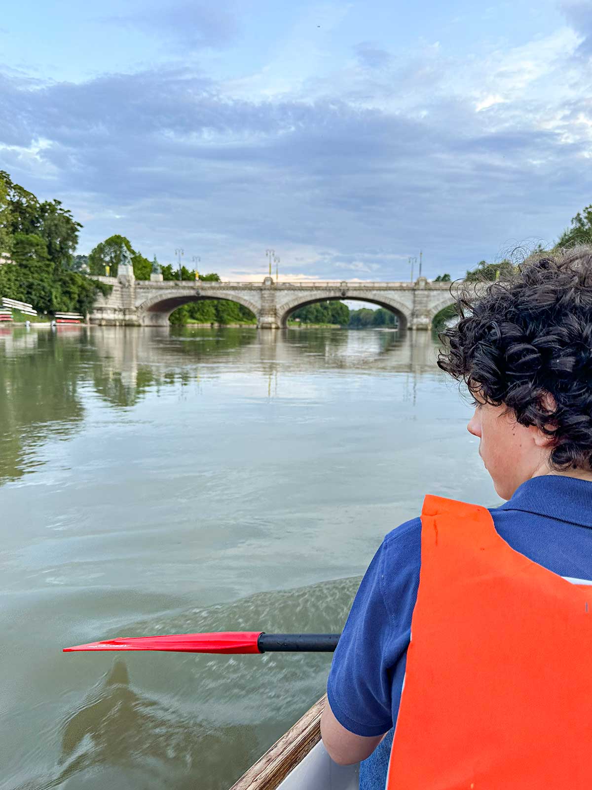 La canoa si muove lenta accarezzando il pelo dell’acqua, costeggiamo il parco del Valentino e ci perdiamo nei colori dell’acqua che rifflette il cielo e la città. Anche i bambini dopo l’eccitazione inziale trovano il tempo del fiume e curiosi si guardano intorno.