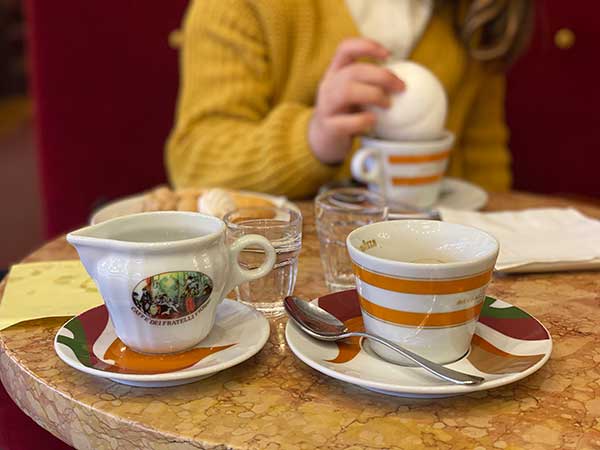 La nostra aspettativa, dopo questo excursus storico, era altissima e devo ammettere che non è stata delusa. Complice un pomeriggio invernale particolarmente rigido, ci siamo accomodati a uno dei tavoli rotondi con le tovaglie candide della Caffetteria Reale di Palazzo Reale (scelta perfetta se ci si trova in centro) e, circondati da una splendida collezione di porcellane settecentesche, abbiamo provato la nostra merendad’antan. Eccezionale. I bambini hanno avuto un tavolino a parte vista Giardini reali e hanno degustato la loro minicioccolata (è possibile richiedere una mezza porzione) come veri nobili.