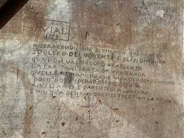 Al quarto piano invece ci sono le tracce di quelle che un tempo furono le prigioni della Curia. La Torre dei Prendiparte, infatti, a metà del ‘500 venne adibita ad estensione del Seminario Arcivescovile, ma nel 1751 il Card. Lambertini Papa Benedetto XIV quando il Seminario fu trasferito, la adattò a carcere dell’Arcivescovado per reati contro la religione o che avessero comunque rappresentato un oltraggio alla morale cristiana. Si vedono ancora le iscrizioni e i graffiti che i prigionieri facevano con le scaglie dei mattone della torre. Ci sono il conto dei giorni che passano, ma anche vere e proprie scritte.