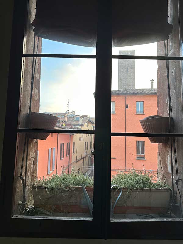 E alla fine, all’ultimo piano c’è la terrazza che, grazie ad un sicuro parapetto, permette di affacciarsi e ammirare la vista dei tetti e dei monumenti, delle colline e della pianura di Bologna. Noi siamo arrivati in cima al tramonto e la luce gialla di Bologna, mista al cielo che si tingeva di rosa, è stato un dono inaspettato. Uno di quei panorami da wow.