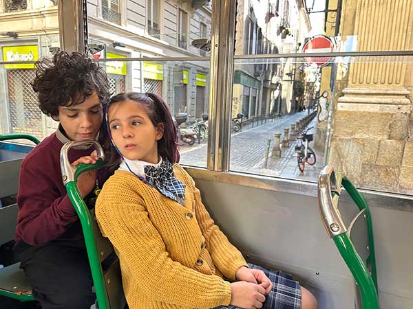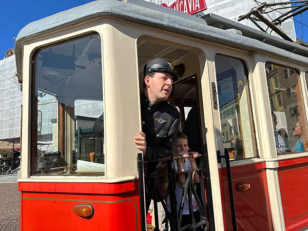 E la passione ha fatto la differenza in questo nostro giro sui binari del tempo. Piccoli dettagli hanno fatto la differenza, come Stefano che suonava la campana se vedeva un bimbo per strada e il piccolo subito alzava lo sguardo, sorrideva e salutava (quando succede nelle nostre strade oggi?), o la scritta in alto sulle panche di legno “non sputare”, il cambio manuale degl iscambi, gli sguardi attenti dei bambini sul tram, le pagine del libro di Edmondo de Amicis raccontate con garbo da Gianfranco. “Si guidava il tram in piedi , dalle sei di mattina alle dieci e mezza di sera – racconta Stefano – e quando si passò dal tram a cavalli a quello elettrico inizialmente non solo non c’erano le porte laterali, ma neanche il parabrezza, “gli autisti dovettero fare dieci giorni di sciopero in tutt’Italia per avere il parabrezza”, incalza Gianfranco mentre il tram corre sui binari di oggi e noi viviamo storie di un altro tempo, con i giovanotti che salgono e scendono dal tram al volo e chi si ferma a comprare i giornale e risale …un tram che trasporta vite e in cui sembra di attraversare la porta del tempo.