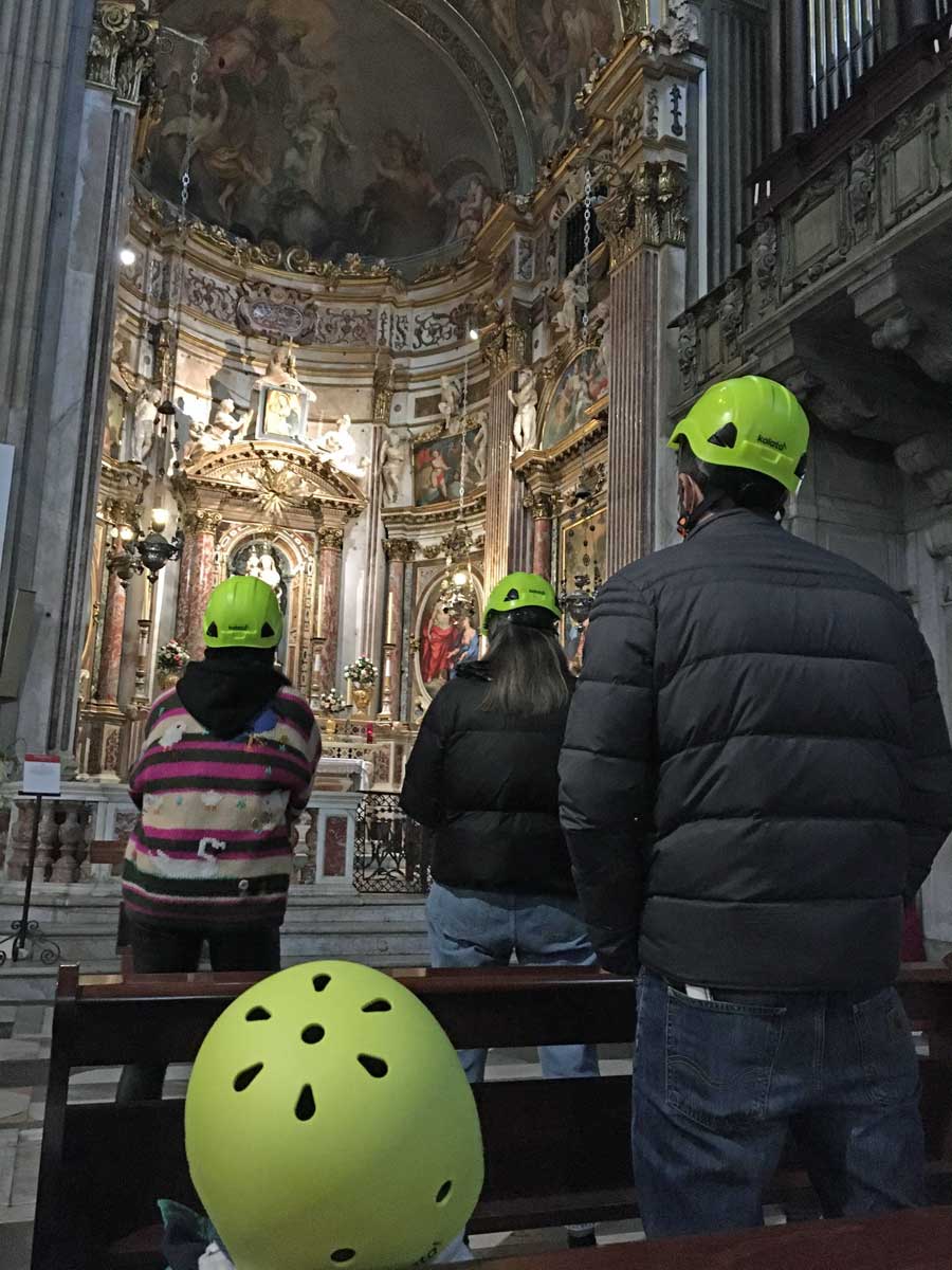 La nostra guida ci ha aspettato nella Piazza delle Vigne, per darci il benvenuto e accompagnarci nella loro sede a pochi passi di distanza dove abbiamo lasciato zaini e borse e … indossato i caschetti (una questione di sicurezza ma anche un simpatico modo per pre immergersi nell’esperienza).