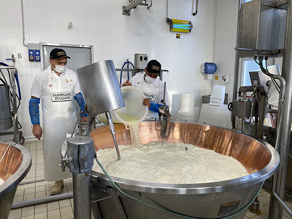 Inizia la visita: il latte parzialmente scremato, appena munto, viene riversato in 12 caldaie, con una temperatura che viene portata a 28 gradi. Ogni caldaia contiene mille litri di latte e, da ciascuna, a fine giornata si producono due forme di Parmigiano Reggiano.