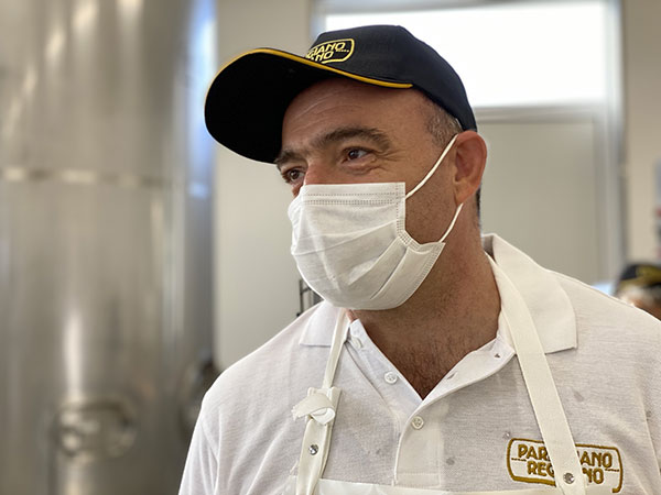 Matteo è attento, vigile, e anche se ha la mascherina si vede che sorride. Ha iniziato a lavorare in un caseificio a 17 anni e lavora da 31. Ogni forma di Parmigiano Reggiano qui nasce dalla sua grande esperienza e dalla sua passione. “ll latte è vivo – ci racconta – ogni giorno il lavoro sembra uguale e ripetitivo, ma non è così, ci sono tantissime variabili e non hai mai imparato tutto. Ogni giorno è un piccolo miracolo”. E poi con orgoglio aggiunge: “Non ci sarà mai una macchina che da sola potrà fare il Parmigiano Reggiano, ci vorrà sempre l’uomo e la sua sensibilità ed esperienza”.