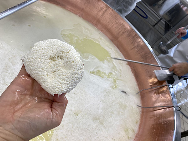 I granuli precipitano sul fondo della caldaia e formano una grande massa celastica e compatta, he pesa cento chili (da mille litri di latte), con il siero, invece, si fa la ricotta: con l’aggiunta di panna e sale.