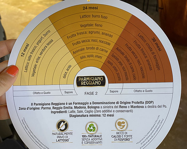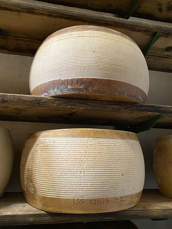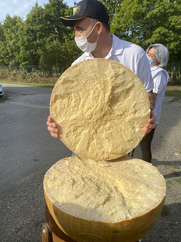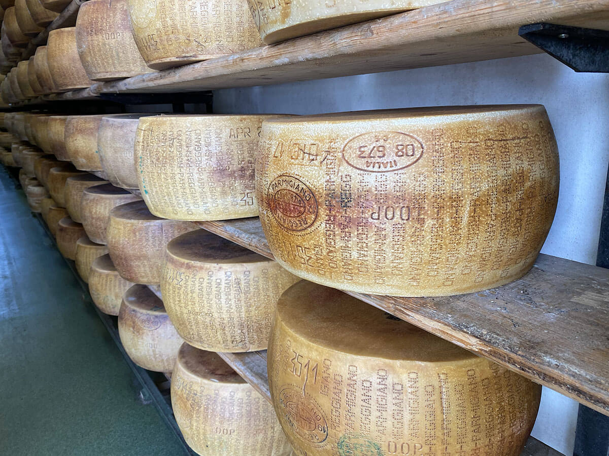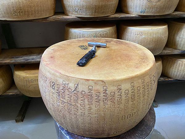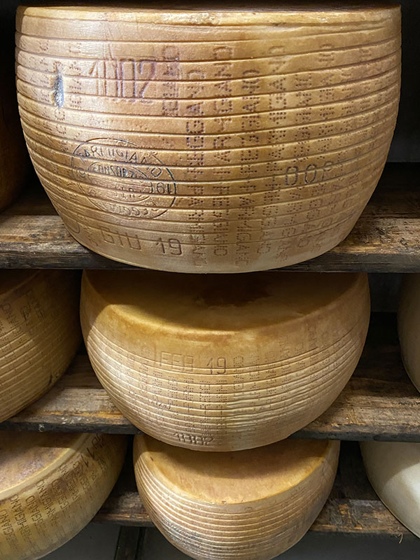 Nei magazzini di stagionatura (dove c’è un profumo pazzesco) le forme riposano e vengono curate quotidianamente, in attesa del dodicesimo mese quando vengono ispezionate dagli esperti del Consorzio per essere marchiate a fuoco e raggiungere la giusta maturazione, da 24 mesi e oltre.
