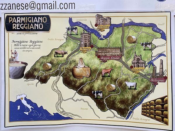 - Il Parmigiano Reggiano viene prodotto in cinque province Reggio Emilia, Modena, Parma e Bologna a sinistra del fiume Reno e Mantova a destra del Po. Viene prodotto in 300 caseifici, grazie al supporto di 2500 aziende agricole.