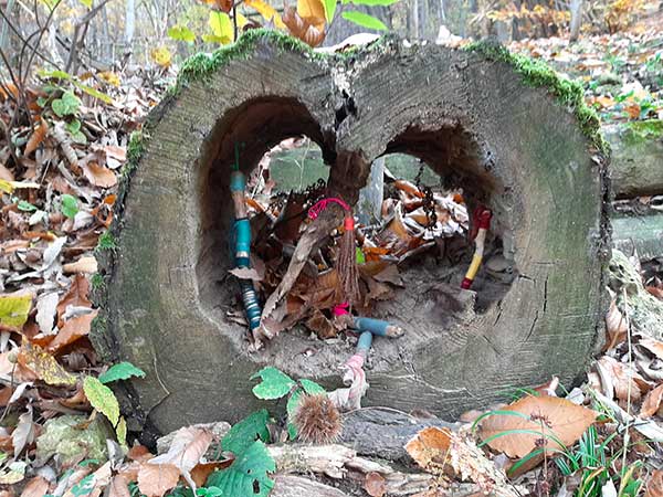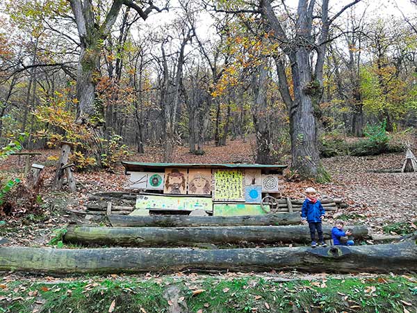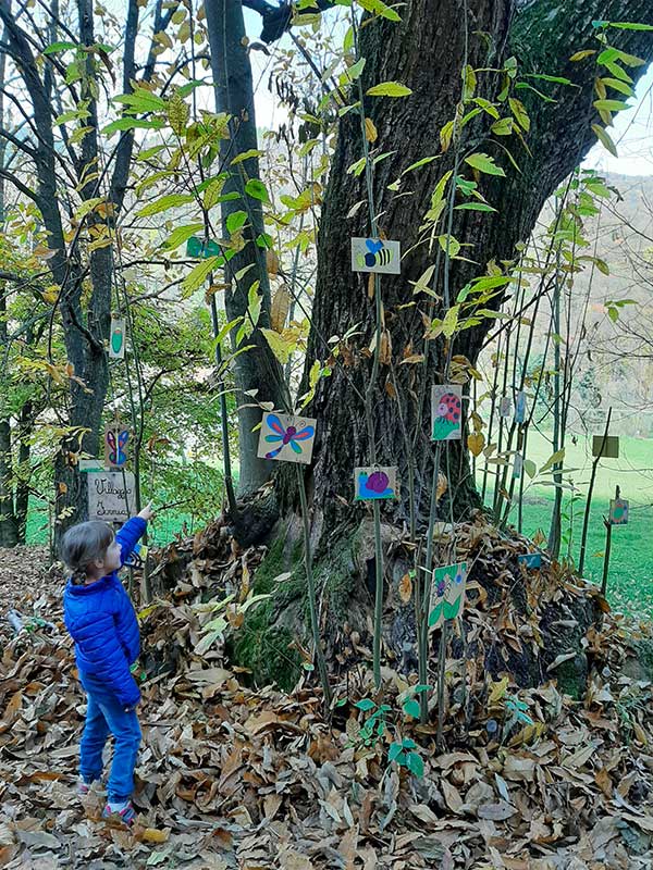 Per questo motivo, oltre alla land art, ai cartelli posizionati lungo il percorso con tante curiosità sul bosco e chi vi abita, è stata fortemente voluta una meravigliosa “aula nel bosco” dove non ci sono banchi ma solo tronchi di alberi intagliati e, al posto della lavagna, pannelli di legno sui quali attaccare i dipinti dei bambini. Qui e là troviamo nidi intrecciati con rami secchi, disegni di piccole farfalle e insetti appesi agli alberi, e, nascosta tra la vegetazione, c’è persino una tenda degli indiani.