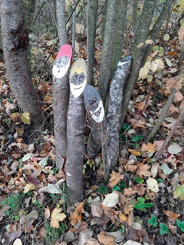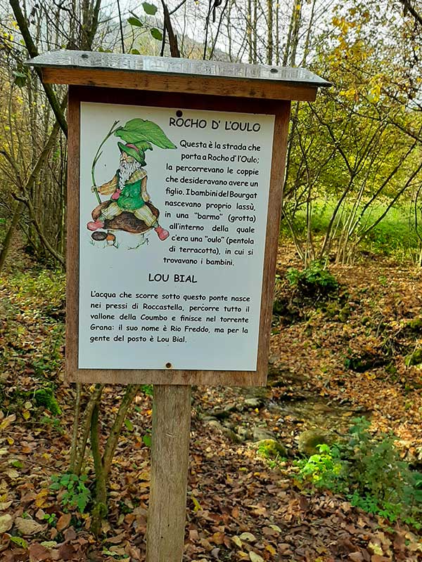 “Bestie e Bestiete” recitano i cartelli in occitano, una volta giunti nel piccolo borgo che chiude il cerchio del sentiero, ovvero, le volpi, i cinghiali, i gufi, i caprioli, in cui i bambini possono immedesimarsi: l’autrice ha realizzato dei pannelli con la figura da cui si possono togliere gli occhi per guardare con i propri. Nonostante la fame e la stanchezza, dopo quasi due ore di cammino i bambini hanno trovato le energie per farsi fare una fotografia fingendo di essere ogni volta un animale diverso e correndo alla ricerca di quello successivo.