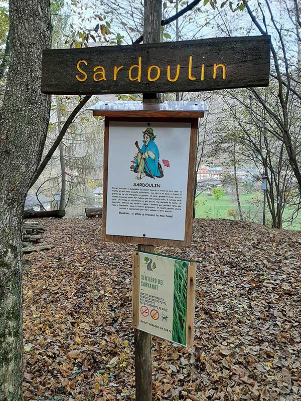 Da questa leggenda sono partiti i volontari che da 10 anni, instancabilmente, tengono pulito questo bosco e lo arricchiscono con cartelli e disegni esplicativi della natura circostante. E così sarà proprio il Sarvanot, insieme ai suoi amici folletti, ad accompagnarvi in questo un percorso ad anello di circa 5 km (due ore): li troverete su oltre 50 cartelli posti lungo il percorso, nel tratto a sud (à l’ubai) vi racconteranno le storie di quei luoghi e le origini degli alberi che “popolano” i boschi del paese, mentre nel tratto a nord (à la drech) vi presenteranno i loro principali compagni di giochi, ovvero animali molto speciali in cui potrete immedesimarvi.