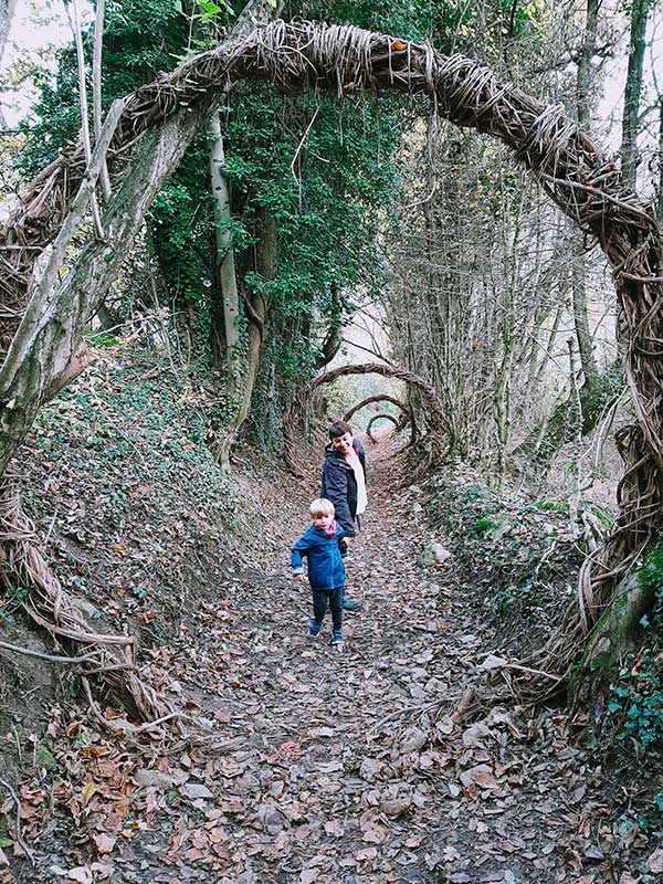 Il sentiero è pianeggiante e alterna zone boschive con a radure, ci si ferma spesso per raccogliere castagne o mangiare lamponi selvatici e more o perché ci si imbatte in qualche piacevole sorpresa: l’associazione Anelli di Crescita  ha, infatti, realizzato in un tratto abbandonato da quasi cinquant’anni un’installazione semi permanente (nei mesi più freddi viene rimossa) a cerchi concentrici con materiale naturale appartenente al bosco stesso. Abbiamo incontrato sul posto Elena Rosso, una delle fondatrici, che ci ha raccontato spiegato la filosofia dell’associazione con le parole: “il poco è tanto”, l’obiettivo è quello di coinvolgere adulti e bambini in una esperienza immersiva con la natura che segua il ritmo delle stagioni. Semplicità è la loro  bandiera, senza voler intrattenere con effetti speciali e iperstimolanti.