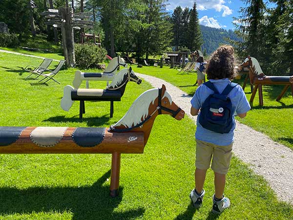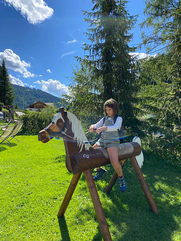 E come tutto in Val Gardena, il parco giochi della Baita Ciampac, non è un comune parco giochi: ha una fila di cavalli di legno da cavalcare immaginando avventure e sognando di essere cowboy e cowgirl.