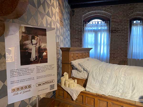 Al primo piano della torre, in un ambiente più raccolto, si trova invece la “camera da letto”. Dove si può vedere il letto che venne usato nel film “Romeo e Giulietta” di Franco Zeffirelli, una delle più famose versioni cinematografiche della storia. È opera di falegnami veronesi e, preparato con lenzuola e cuscini si ha la sensazione che Giulietta vi si debba coricare da un momento all’altro.