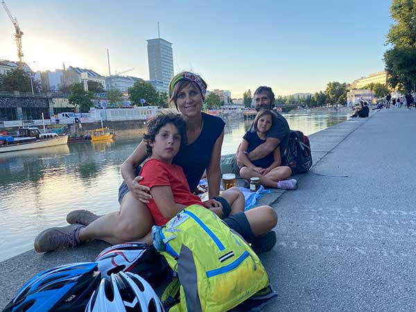 Vienna è assolutamente una città a misura di bici. Però alcune piste ciclabili ogni tanto si interrompono e bisogna confluire sulle strade con le auto o (come abbiamo fatto noi, con i bambini) con molta attenzione sui marciapiedi pedonali (ma siamo scesi dalle bici).