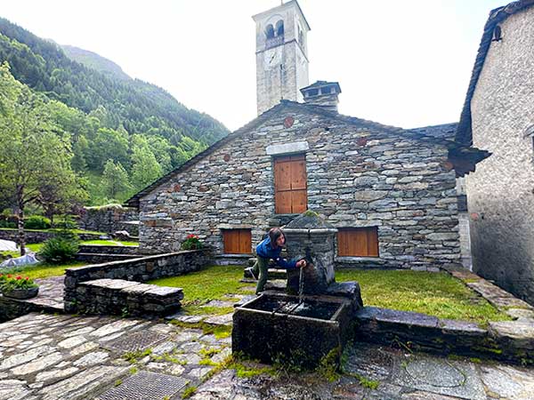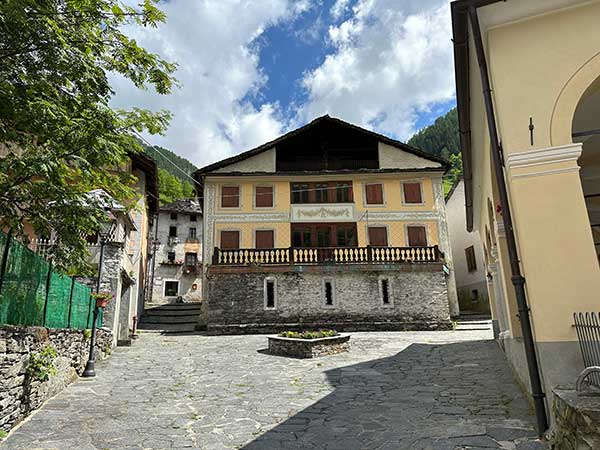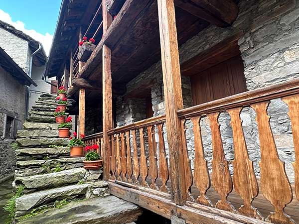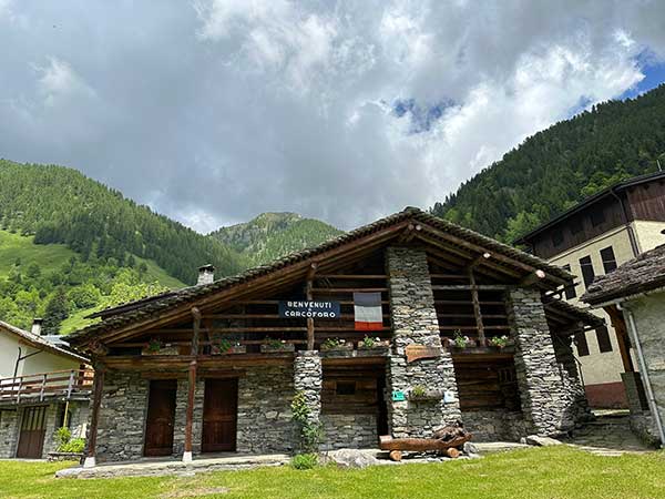 Il secondo villaggio walser che abbiamo visitato è quello di Carcoforo. Si entra dall’arco della Buona Accoglienza, costruito nel 1734 alla fine della mulattiera che saliva dal fondovalle e collegava il villaggio con la Francia. Anche a Carcofaro è bello passeggiare tra le tipiche case walseriane in pietra e legno, con il naso all’insù per ammirare le pareti dipinte e i balconi.