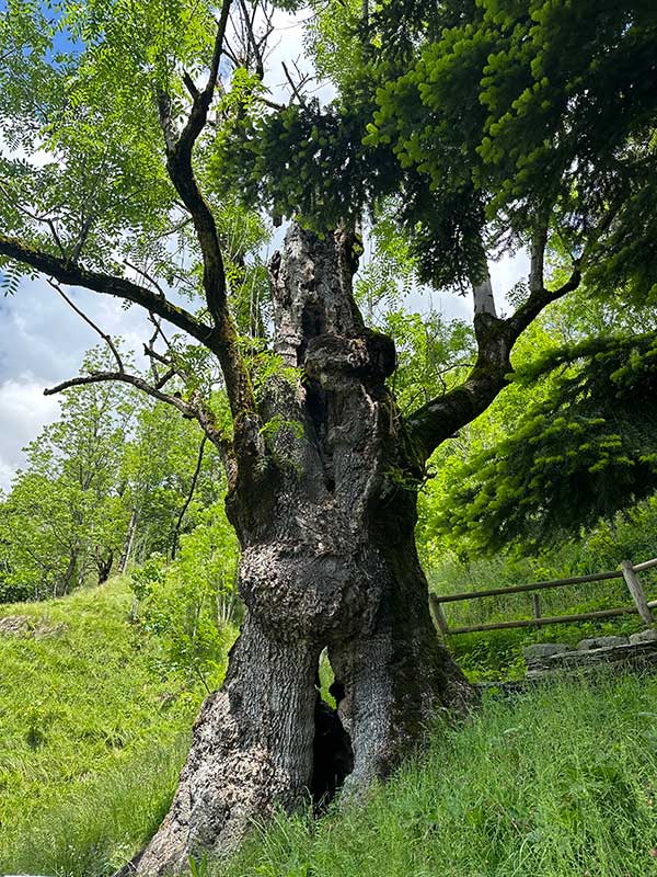 Fate anche una breve passeggiata di cinque minuti fuori dal paese per vedere il frassino secolare di Carcofaro, una pianta alta 21 metri, con un fusto totalmente cavo di 5,4 m di circonferenza, un vero patriarca nelle vicinanze del borgo Alpino noto anche con il nome di “an Ciüma la Villa” o “Frasso dal vote”. Accanto c’è anche un larice, molto più grande, ma anche molto più giovane, nonostante l’imponenza.