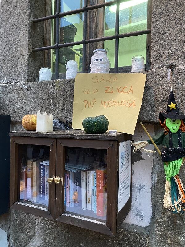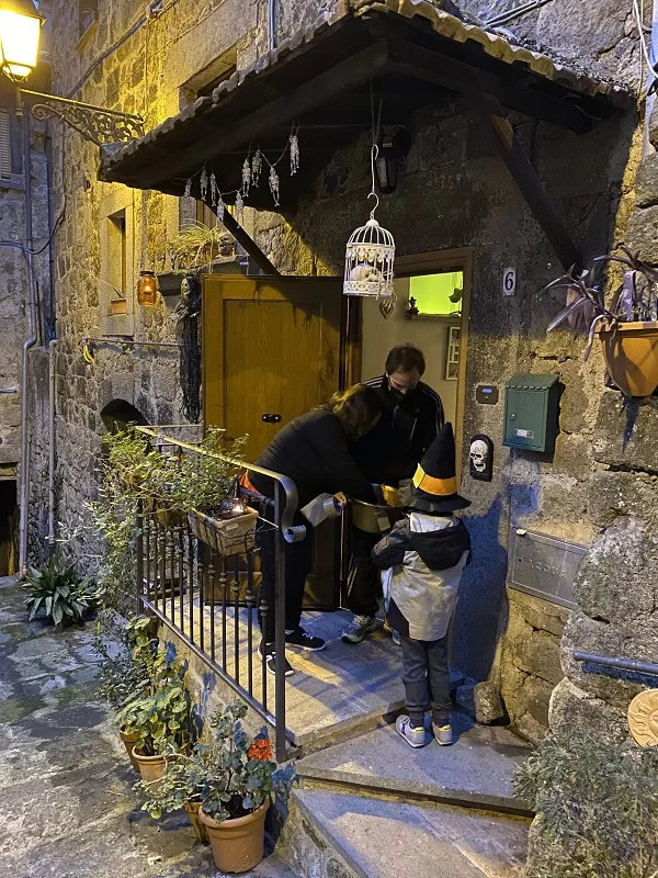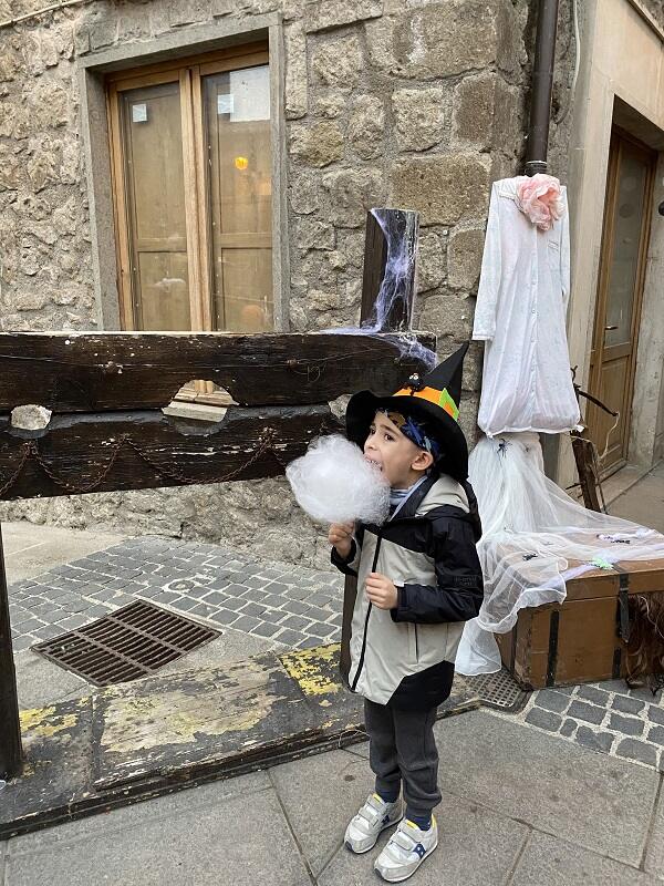 Ma noi ci innamorati di Vitorchiano dopo averla vissuta di sera. La scelta di dormire all’interno del borgo non poteva essere più azzeccata. Ci ha permesso di continuare a vivere questo borgo senza tempo, quando ormai tutte le luci della festa si erano spente ed erano rimaste solo quelle fioche dei lampioni. Cosi abbiamo iniziato a bussare alle porte per fare dolcetto o scherzetto, con la nostra zucca pronta ad accogliere caramelle e cioccolatini. In verità, in un intero borgo, abbiamo trovato solo una porta aperta…una dolcissima famiglia che aveva addobbato tutto l’ingresso e che ha regalato a Manuel tantissimi dolcetti.