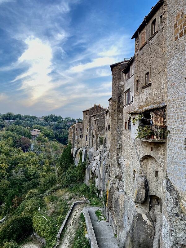 Visto da fuori le mura che cingono il paesino, fa quasi impressione vedere le case a strapiombo, costruite con la stessa roccia su cui si poggia, in un delicato equilibrio, il borgo di origine etrusca. Affacciarsi da una di quelle finestre è davvero un’esperienza da brividi. A noi ci ha ricordato molto un borgo campano, altrettanto sospeso come questo, in provincia di Benevento, Sant’Agata de Goti.