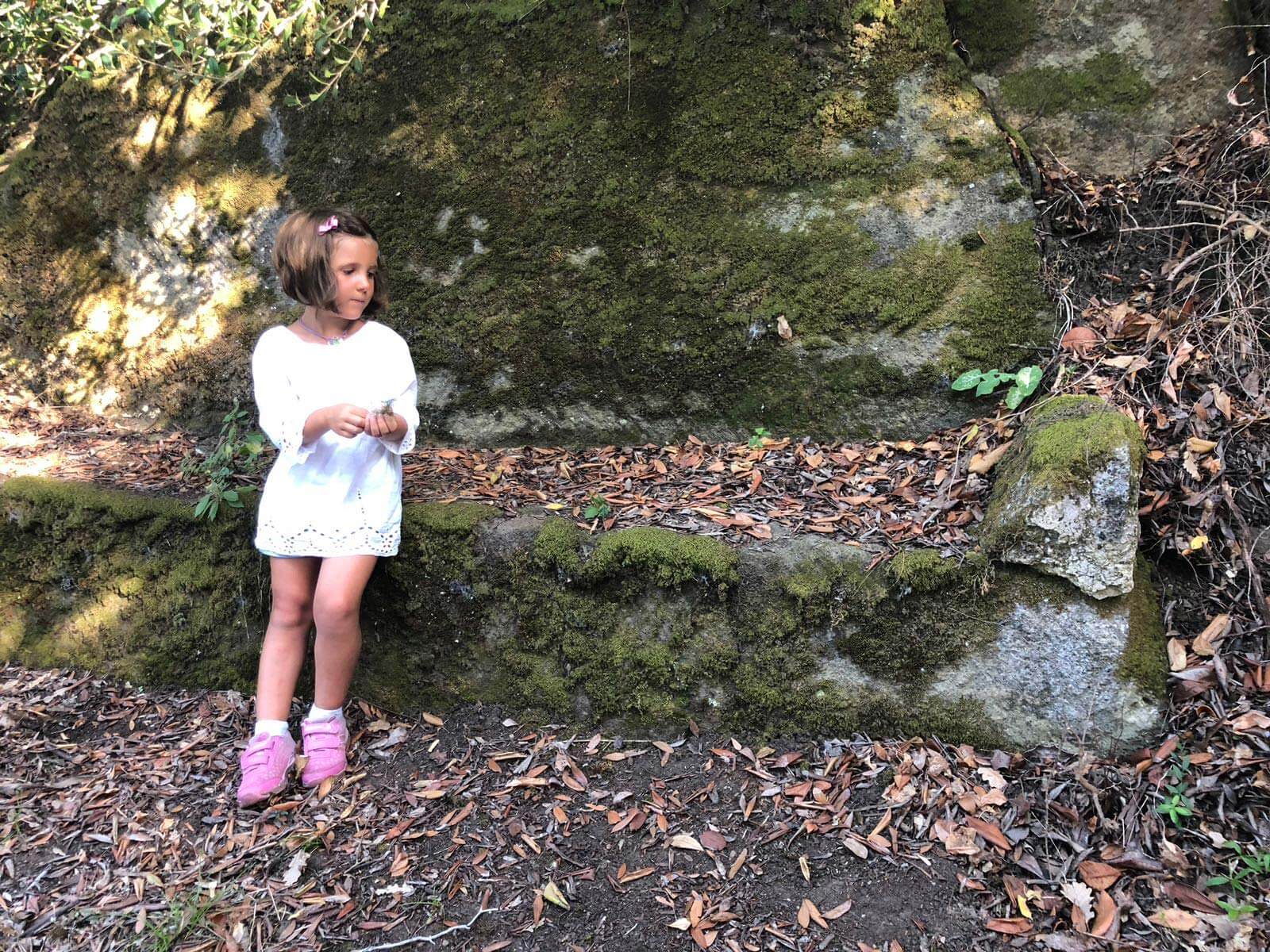 Michele per spiegare la macchia mediterranea mostra loro le diverse foglie, quelle ad ago, quelle con i peli, quelle oleose, e fa sentire ai piccoli escursionisti tutti gli odori del mirto, del lentisco, della mentuccia e del finocchio marino, dell’inula. I bambini fanno, volando, gli 80 scalini che la principessa Maria Josè percorreva in groppa al suo asinello. La  passeggiata in questo angolo incontaminato è anche un viaggio tra i profumi della macchia mediterranea. I bimbi non si annoiano e camminano volentieri, accompagnati dalle storie