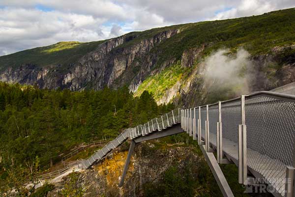 Il ponte sembra un ragno di metallo ,con le zampe conficcate nella roccia. Si cammina sospesi sulla valle di Måbødalen. Ha una campata di 47 metri e 99 gradini che uniscono i due lati del canyon stretto e ripido di Hardangervidda, il più grande parco nazionale nella regione nordica. Il dislivello tra le estremità del ponte è di 16 metri e la sua costruzione ha richiesto più di un decennio.